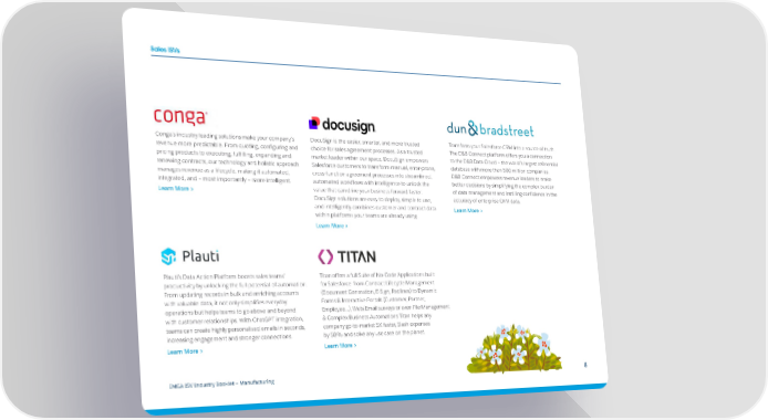 Sales ISVs Conga’s industry leading solutions make your company’s DocuSign is the easier, smarter, and more trusted Transform your Salesforce CRM into a source of truth. revenue more predictable. From quoting, configuring and choice for sales agreement processes. As a trusted The D&B Connect platform offers you a connection pricing products to executing, fulfilling, expanding and market leader within our space, DocuSign empowers to the D&B Data Cloud – the world´s largest referential renewing contracts, our technology and holistic approach Salesforce customers to transform manual, error-prone, database with more than 500 million companies. manages revenue as a lifecycle, making it automated, cross-function agreement processes into streamlined, D&B Connect empowers revenue leaders to make integrated, and – most importantly – more intelligent. automated workflows with intelligence to unlock the better decisions by simplifying the complex burden Learn More > value that can drive your business forward faster. of data management and instilling confidence in the DocuSign solutions are easy to deploy, simple to use, accuracy of enterprise CRM data. and intelligently combines customer and contract data Learn More > within platforms your teams are already using. Learn More > Plauti’s Data Action Platform boosts sales teams’ Titan offers a full Suite of No-Code Applications built productivity by unlocking the full potential of automation. for Salesforce: from Contract Lifecycle Management From updating records in bulk and enriching accounts (Document Generation, E-Sign, Redlines) to Dynamic with valuable data, it not only simplifies everyday Forms & Interactive Portals (Customer, Partner, operations but helps teams to go above and beyond Employee…), Web/Email surveys or even File Management with customer relationships. With ChatGPT integration, & Complex Business Automations Titan helps any teams can create highly personalised emails in seconds, company go-to-market 5X faster, Slash expenses increasing engagement and stronger connections. by 50% and solve any use case on the planet. Learn More > Learn More > EMEA ISV Industry Booklet — Manufacturing 8
