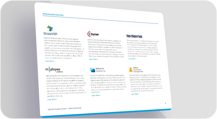 Professional Services ISVs StrataVAR PqW provides a flexible and integrated Byner is a frontrunning solution especially designed for Staffing companies use Textkernel’s integration to rapidly native Salesforce solution for Value-Added Resellers Project Staffing, Permanent Placement and Contract build critical recruiting workflows into their Salesforce (VARs) in the IT sector to add Professional Services to Recruitment in Europe. A trusted backbone to durably ATS. Customers drastically improve the time-to-value their quotes. PqW enables complete integration with engage with customers, suppliers and talent throughout from their Salesforce investment, starting quickly with suppliers and vendors such as Cisco, HP, Dell, Ingram, TD the entire journey. From lead gen and inflow of configuration instead of custom development. For over Synnex, Westcom, and others. Downstream integration professionals to deployment and invoicing. Combined two decades Textkernel has used AI to solve recruiting with Revenue Cloud, while running side by side, or ERP with their dedicated partnership and inspiring community, business problems. Our technology is used by 8 of the 10 systems such as SAP or FinancialForce, allows VARs to Byner is your catalyst for growth in Staffing & Recruitment. largest global staffing companies. create a seamless end-to-end process. Learn More > Learn More > Learn More > Mployee by Bullhorn transforms the management of Bullhorn for Salesforce is the leading enterprise-grade Bullhorn Workforce Management (FKA Sirenum) is the middle office processes for the staffing and recruiting applicant tracking and recruitment CRM solution on the leading solution for staffing firms to manage their shift- industry natively on the Salesforce platform. Purpose- AppExchange. Built natively on the Salesforce platform based workforce, helping organisations transform their built to handle the complexities of the most demanding and leveraging Bullhorn’s 25 years as an industry leader, business operations by streamlining staff management and innovative recruitment agencies, Mployee powers Bullhorn for Salesforce powers the recruiting, sales, and to save costs, reduce risks, and increase revenue. Our key functionality such as rates management, labor operational processes within the world’s leading staffing Salesforce-native solution enables management to save agreements, time registration and approval, and time agencies, executive search firms, and talent services valuable time in scheduling shifts, managing compliance, interpretation in order to drive faster and more efficient organisations. monitoring staff, and processing payroll. payroll and invoicing. Learn More > Learn More > Learn More > EMEA ISV Industry Booklet — Professional Services 5
