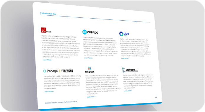 IT Infrastructure ISVs Vigience helps companies to bridge the gap between Copado Solutions is a leading provider of Salesforce Deploying an IT and security-compatible data quality Salesforce and SAP. Their Salesforce App, Vigience Release Management and Continuous Delivery Platform. solution is crucial. IT departments and CISOs must Overcast, enables business processes across system We provide a complete Release Management solution with prioritise providing business lines with efficient solutions boundaries and provides ready-to-use application content Agile Continuous Delivery, Version Control, Automated that meet their needs without compromising security to integrate SAP and other ERP systems with Salesforce Deployments, Automated Regression Testing, Rollbacks, or overloading the IS. Among these, customer data within days. Overcast can be deployed as a complement Automated Compliance Scan, Scheduled Metadata management requires a 360-degree view and quick to MuleSoft or as a standalone solution in your Salesforce backups and more. Copado allows customers to maximise database access. DQE offers tailored solutions: DataQ for org. Vigience provides 150+ out-of-the-box integrations their Salesforce investments by increasing speed, quality real-time data validation and optimisation and Unify for (UI, business logic + integration) that work with public and efficiency of their developments on Salesforce. easy deduplication and database merging. APIs on the SAP side (zero SAP footprint). Learn More > Learn More > Learn More > Panaya ForeSight enables Infrastructure & Data Security enosix is an independent software provider focused on Elements.cloud is the Change Intelligence platform that companies the ability to swiftly adapt and react to the transforming the way companies integrate with SAP. helps you accelerate your time to value from Salesforce. ever-shifting market. However, these companies may Companies around the world rely on enosix to enable It enables you to manage org complexity, reduce tech encounter significant challenges when implementing seamless access to SAP data and SAP processes from debt, and improve your documentation. This allows you changes in their business systems, slowing down their Salesforce providing increased selling time and better to make intelligent change decisions, with confidence. innovation pace. customer engagement. All of these capabilities are Changes are implemented faster. Rework is reduced. Learn More > delivered in a fraction of the time compared to traditional User adoption soars. integration approaches. For more information visit Learn More > www.enosix.com. Learn More > EMEA ISV Industry Booklet — Professional Services 22