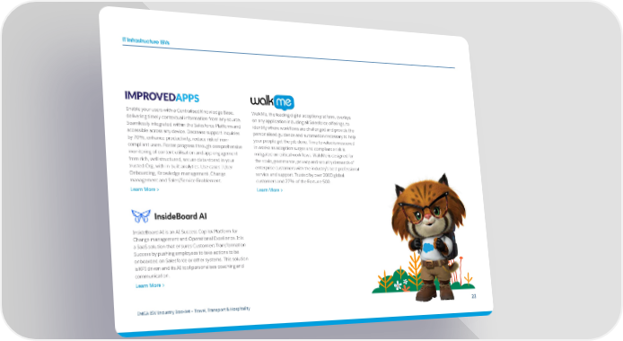 IT Infrastructure ISVs Enable your users with a Centralised Knowledge Base, WalkMe, the leading digital adoption platform, overlays delivering timely contextual information from any source. on any application including all Salesforce offerings, to Seamlessly integrated within the Salesforce Platform and identify where workflows are challenged and provide the accessible across any device. Decrease support inquiries personalised guidance and automation necessary to help by 70%, enhance productivity, reduce risk of non- your people get the job done. Time to value is measured compliant users. Foster progress through comprehensive in weeks as adoption surges and compliance risk is monitoring of content utilisation and app engagement mitigated on critical workflows. WalkMe is designed for from rich, well structured, secure data stored in your the scale, governance, privacy and security demands of trusted Org, with in-built analytics. Use cases | User enterprise customers with the industry’s best professional Onboarding, Knowledge management, Change service and support. Trusted by over 2000 global management and Sales/Service Enablement. customers and 27% of the Fortune 500. Learn More > Learn More > InsideBoard AI is an AI Success Copilot Platform for Change management and Operational Excellence. It is a SaaS solution that ensures Customers Transformation Success by pushing employees to take actions to be onboarded on Salesforce or other systems. This solution is KPI driven and its AI tool personalises coaching and communication. Learn More > EMEA ISV Industry Booklet — Travel, Transport & Hospitality 23
