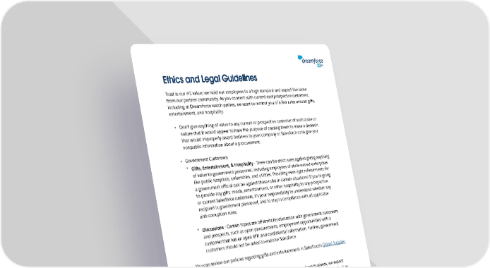 Ethics and Legal Guidelines Trust is our #1 value; we hold our employees to a high standard and expect the same from our partner community. As you connect with current and prospective customers, including at Dreamforce watch parties, we want to remind you of a few rules around gifts, entertainment, and hospitality. • Don’t give anything of value to any current or prospective customer of such a size or nature that it would appear to have the purpose of causing them to make a decision that would improperly award business to your company or Salesforce or to give you nonpublic information about a procurement. • Government Customers ° Gifts, Entertainment, & Hospitality - There can be strict rules against giving anything of value to government personnel, including employees of state-owned enterprises like public hospitals, universities, and utilities. Providing even light refreshments for a government official can be against these rules in certain situations! If you’re going to provide any gifts, meals, entertainment, or other hospitality to any prospective or current Salesforce customers, it’s your responsibility to understand whether any recipient is government personnel, and to stay in compliance with all applicable anti-corruption rules. ° Discussions - Certain topics are off-limits for discussion with government customers and prospects, such as open procurements, employment opportunities with a customer that has an open RFP, and confidential information. Further, government customers should not be asked to endorse Salesforce. You can review our policies regarding gifts and entertainment in Salesforce's Global Supplier Code of Conduct. If you have good faith concerns about conduct related to Salesforce business, we expect that you will notify us via EthicsPoint (anonymous reporting available in many countries) or via email to legalcompliance@salesforce.com. This applies to suspected misconduct within your organization, Salesforce, or any other third party. Note for public sector entities: If you are one of the first 50 to download the Dreamforce '22 Watch Party Playbook and receive a free giveaway gift, please note that this may be considered a gift to your organization and you are responsible for ensuring compliance with all applicable laws, rules, regulations, and ethics policies of your organization. If you are selected to receive a free giveaway gift and are not able to accept it, please notify us immediately. Copyright © 2022 Salesforce.com, inc. All rights reserved. For Partner’s internal use only. 4