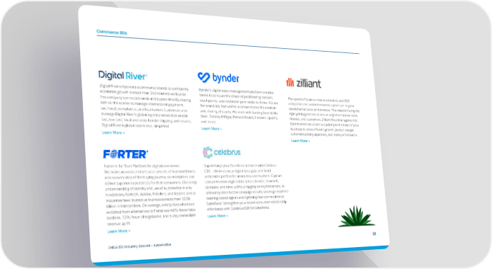 Commerce ISVs Digital River empowers ecommerce brands to confidently Bynder’s digital asset management platform enables accelerate growth in more than 240 markets worldwide. teams to conquer the chaos of proliferating content, The speed of business has accelerated, and B2B The company connects brands and buyers directly, staying touchpoints, and relationships in order to thrive. We are companies are under tremendous pressure to grow behind the scenes to manage international payments, the brand ally that unifies and transforms the creation omnichannel sales and revenue. That means having the tax, fraud, compliance, and localisation. Customers also and sharing of assets. We work with leading brands like right pricing process to ensure alignment across sales, leverage Digital River’s global logistics network to enable Shell, Tommy Hilfiger, Pernod Ricard, Siemens, Spotify, finance, and customers. Zilliant Price Management & fast, low cost, local and cross-border shipping and returns. and more. Optimisation solutions put pricing at the heart of your Digital River is global commerce, simplified. Learn More > business to drive efficient growth, protect margin, Learn More > automate pricing approvals, and track performance. Learn More > Forter is the Trust Platform for digital commerce. Supercharge your Salesforce instance with Celebrus We make accurate, instant assessments of trustworthiness CDI – eliminate your digital data gaps and build across every step of the buying journey so enterprises can actionable profiles for anonymous consumers. Capture deliver superior experiences for their consumers. Our deep comprehensive digital data across devices, channels, understanding of identity and use of automation is why domains, and time, without tagging or any limitations, to Nordstrom, Farfetch, Adidas, Priceline, and leaders across ultimately drive better campaign results. Leverage machine industries have trusted us to process more than $500 learning-based signals and lightning-fast connections to billion in transactions. On average, enterprises who have Salesforce. Strengthen your brand-consumer relationship switched from alternatives to Forter see 46% fewer false effortlessly with Celebrus CDI for Salesforce. declines, 72% fewer chargebacks, and a very immediate Learn More > revenue uplift. Learn More > EMEA ISV Industry Booklet — Automotive 18