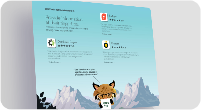 CUSTOMER RECOMMENDATIONS Swiftype Provide information 5.0 at their fingertips. “ Swiftype enables me to look at an account in Salesforce and see all my notes about where Help agents easily find information to make customers were before I reach out to them.” CHRIS CRANE solving cases more efficient. Find out more > Distribution Engine Q-assign 5.0 4.6 “ Distribution Engine offers automated case assignment. “ Q-assign helps us maintain changes to our round The teams get along better knowing there’s fairness and robin distributions and provides the flexibility even reasoning behind their case assignments.” with the most complex distributions.” COLLIN MARTIN BART KORZILIUS Find out more > Find out more > “UseSalesforcetogive agentsasinglesourceof truth around customers.” APPY TIP