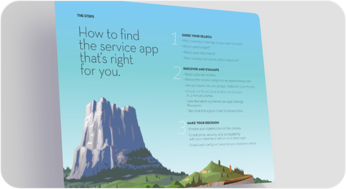 THE STEPS GUIDE YOUR SEARCH How to find 1• What business challenge do you want to solve? • What’s your budget? the service app • What’s your time frame? that’s right • What business processes will be impacted? DISCOVER AND EVALUATE for you. 2• Read customer reviews. • Browse the service categories on appexchange.com. • Ask your peers via user groups, Trailblazer Community. • Check out Demo Jams to learn about apps in 3-minute pitches. • View the latest app trends on AppExchange Resources. • Test drive the app or install in the sandbox. MAKE YOUR DECISION 3• Involve your stakeholders in the process. • Check price, security, and compatibility with your Salesforce edition and other apps. • Install and configure based on your business needs.