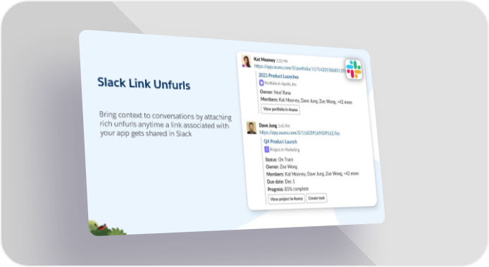 First level text is set at twenty point Salesforce Sans and does not have a bullet Slack Link Unfurls • Second level is eighteen point Salesforce Sans First level text is set at twenty point Salesforce Sans and does not have a bullet Bring context to conversations by attaching • Second level is eighteen point Salesforce Sans rich unfurls anytime a link associated with your app gets shared in Slack