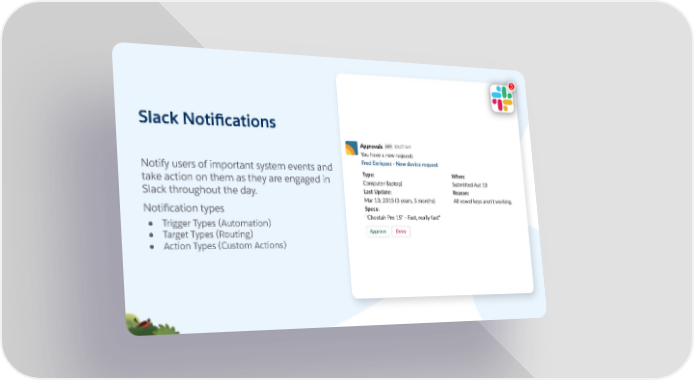 3 Slack Notifications Notify users of important system events and take action on them as they are engaged in Slack throughout the day. Notification types ● Trigger Types (Automation) ● Target Types (Routing) ● Action Types (Custom Actions)