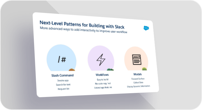Next-Level Patterns for Building with Slack More advanced ways to add interactivity to improve user workflow /# Slash Command Workflows Modals Invoke app Easy to build Focused Surface Search for text No code required Collect Data Request list Extend app features Display Dynamic Information
