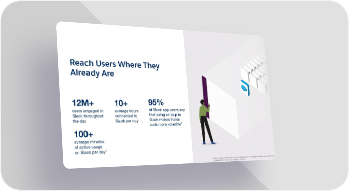 Reach Users Where They Already Are 95% 12M+ 10+ of Slack app users say users engaged in average hours that using an app in Slack throughout connected to 1 Slack makes those the day Slack per day 2 tools more valuable 100+ average minutes of active usage 1 on Slack per day 1. Usage figures are measured for users at Paid customers on a typical workday, as of 10/31/2020 1. Usage figures are measured for users at Paid customers on a typical workday, as of 10/31/2020 2. Slack customer study on app quality, July 2019 2. Slack customer study on app quality, July 2019