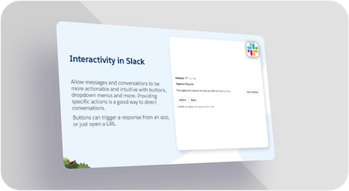 Interactivity in Slack Allow messages and conversations to be more actionable and intuitive with buttons, dropdown menus and more. Providing specific actions is a good way to direct conversations. Buttons can trigger a response from an app, or just open a URL.
