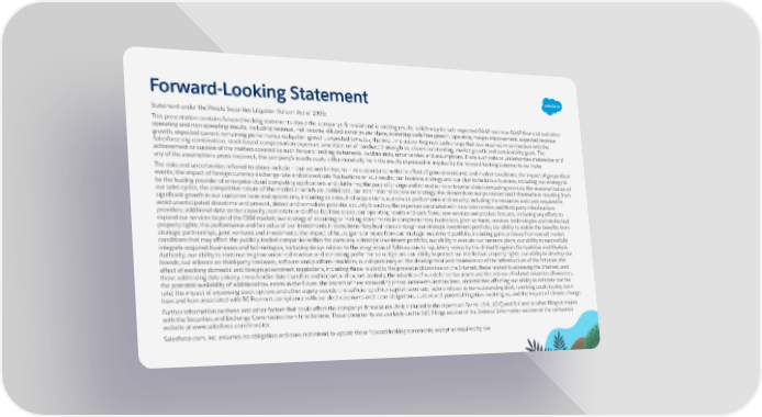 Forward-Looking Statement Statement under the Private Securities Litigation Reform Act of 1995: This presentation contains forward-looking statements about the company’s financial and operating results, which may include expected GAAP and non-GAAP financial and other operating and non-operating results, including revenue, net income, diluted earnings per share, operating cash flow growth, operating margin improvement, expected revenue growth, expected current remaining performance obligation growth, expected tax rates, the one-time accounting non-cash charge that was incurred in connection with the Salesforce.org combination; stock-based compensation expenses, amortization of purchased intangibles, shares outstanding, market growth and sustainability goals. The achievement or success of the matters covered by such forward-looking statements involves risks, uncertainties and assumptions. If any such risks or uncertainties materialize or if any of the assumptions prove incorrect, the company’s results could differ materially from the results expressed or implied by the forward-looking statements we make. The risks and uncertainties referred to above include -- but are not limited to -- risks associated with the effect of general economic and market conditions; the impact of geopolitical events; the impact of foreign currency exchange rate and interest rate fluctuations on our results; our business strategy and our plan to build our business, including our strategy to be the leading provider of enterprise cloud computing applications and platforms; the pace of change and innovation in enterprise cloud computing services; the seasonal nature of our sales cycles; the competitive nature of the market in which we participate; our international expansion strategy; the demands on our personnel and infrastructure resulting from significant growth in our customer base and operations, including as a result of acquisitions; our service performance and security, including the resources and costs required to avoid unanticipated downtime and prevent, detect and remediate potential security breaches; the expenses associated with new data centers and third-party infrastructure providers; additional data center capacity; real estate and office facilities space; our operating results and cash flows; new services and product features, including any efforts to expand our services beyond the CRM market; our strategy of acquiring or making investments in complementary businesses, joint ventures, services, technologies and intellectual property rights; the performance and fair value of our investments in complementary businesses through our strategic investment portfolio; our ability to realize the benefits from strategic partnerships, joint ventures and investments; the impact of future gains or losses from our strategic investment portfolio, including gains or losses from overall market conditions that may affect the publicly traded companies within the company's strategic investment portfolio; our ability to execute our business plans; our ability to successfully integrate acquired businesses and technologies, including delays related to the integration of Tableau due to regulatory review by the United Kingdom Competition and Markets Authority; our ability to continue to grow unearned revenue and remaining performance obligation; our ability to protect our intellectual property rights; our ability to develop our brands; our reliance on third-party hardware, software and platform providers; our dependency on the development and maintenance of the infrastructure of the Internet; the effect of evolving domestic and foreign government regulations, including those related to the provision of services on the Internet, those related to accessing the Internet, and those addressing data privacy, cross-border data transfers and import and export controls; the valuation of our deferred tax assets and the release of related valuation allowances; the potential availability of additional tax assets in the future; the impact of new accounting pronouncements and tax laws; uncertainties affecting our ability to estimate our tax rate; the impact of expensing stock options and other equity awards; the sufficiency of our capital resources; factors related to our outstanding debt, revolving credit facility, term loan and loan associated with 50 Fremont; compliance with our debt covenants and lease obligations; current and potential litigation involving us; and the impact of climate change. Further information on these and other factors that could affect the company’s financial results is included in the reports on Forms 10-K, 10-Q and 8-K and in other filings it makes with the Securities and Exchange Commission from time to time. These documents are available on the SEC Filings section of the Investor Information section of the company’s website at www.salesforce.com/investor. Salesforce.com, inc. assumes no obligation and does not intend to update these forward-looking statements, except as required by law.