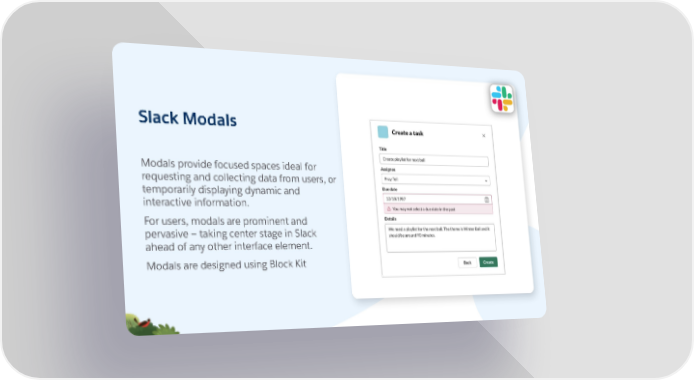Slack Modals Modals provide focused spaces ideal for requesting and collecting data from users, or temporarily displaying dynamic and interactive information. For users, modals are prominent and pervasive — taking center stage in Slack ahead of any other interface element. Modals are designed using Block Kit