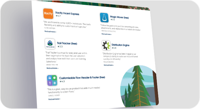 Xactly Incent Express Magic Mover (free) 4.7 3.5 “We use Incent to comp 1,600+ individuals. The tool’s “Follow the guide and you’ll be converting all notes, lfexibility and ability to customize is a huge plus.” attachments, and related lists in a matter of minutes.” NITIN BATHIJA VIRSYS12 CONSULTING Find out more > Find out more > Trail Tracker (free) Distribution Engine 3.3 5.0 “Trail Tracker is a must for every end user within “Distribution Engine has been integral to our their organisation to track the user adoption company’s ability to route our inbound funnel and analyse how well their users are learning quickly and eiffciently.” Salesforce.” TAYLOR DALTON AKASH MISHRA Find out more > Find out more > Customisable Flow Header & Footer (free) 4.3 “This is a great, easy-to-use product that adds much needed functionality to screen lfows.” DANIEL NEWBY Find out more >