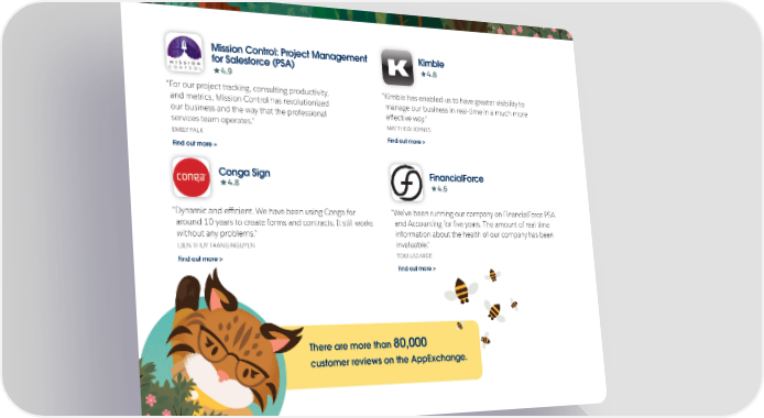 Mission Control: Project Management Kimble for Salesforce (PSA) 4.8 4.9 “For our project tracking, consulting productivity, “Kimble has enabled us to have greater visibility to and metrics, Mission Control has revolutionized manage our business in real-time in a much more our business and the way that the professional effective way.” services team operates.” MATTHEW JOYNES EMILY FALK Find out more > Find out more > Conga Sign FinancialForce 4.8 4.6 “Dynamic and eiffcient. We have been using Conga for “We’ve been running our company on FinancialForce PSA around 10 years to create forms and contracts. It still works and Accounting for ifve years. The amount of real time without any problems.” information about the health of our company has been LIEN THUY TRANG NGUYEN invaluable.” Find out more > TOM LAGARDE Find out more > There are more than 80,000 customer reviews on the AppExchange.