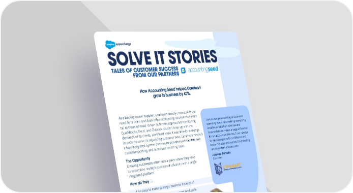 SOLVE IT STORIES SOLVE IT STORIES The Successful Outcome After implementing Accounting Seed and Salesforce with the help of Gimbal Logic, a certified partner, LionHeart has zero data living outside the platform. Every product detail and job is in Salesforce and flows to Accounting Seed for invoice processing and beyond. In addition to custom reports, the out-of-the-box functionality helped LionHeart realize immense growth. Recurring journal entries, amortization, and payables are all key tools that help the accounting team know what the month end will look like well before its closed. The ability to pull data together related to projects and product profitability enabled the accounting team to examine every aspect of the business. The team could see what areas needed improvement and what areas could grow, leading to more strategic decisions to help the business achieve 40% growth. This has resulted in ... • Tasks that used to take days now take a few hours at most • The team now being able to accurately measure KPIs • LionHeart growing 40% without having to add any additional accounting staff or building space Considerations for customers who are looking for an accounting solution. • Use a cloud-based solution with real on-platform accountings tools • If you are pulling together a report more than once a quarter, it’s time to create a custom report • Invest in the right accounting team to drive your company’s growth and revenue goals Learn more about Accounting Seed for Salesforce on AppExchange. Learn more