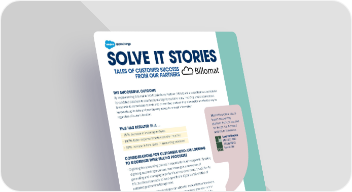 SOLVE IT STORIES TALES OF CUSTOMER SUCCESS FROM OUR PARTNERS THE SUCCESSFUL OUTCOME By implementing Billomat to VKM’s Salesforce Platform, VKM found a cost-effective substitute for its outdated database to seamlessly manage its customer data, invoicing, and sales processes. It was able to consolidate its tasks into one unified platform that allowed for an effective way to keep data up to date and provide easy access to relevant information regardless of a user’s location. Billomat is a robust cloud- THIS HAS RESULTED IN A ... based accounting · 95% decrease in invoicing mistakes platform that can be used on the go. It is the ideal · 100% faster response time to customer inquiries addition to Salesforce. · 50% increase in time saved in accounting processes Lars Heitmann PROJECT AND CONSIDERATIONS FOR CUSTOMERS WHO ARE LOOKING ADVERTISING TO MODERNIZE THEIR SELLING PROCESSES MANAGER · Digitizing the accounting process is essential for business growth. By safely digitizing accounting processes, businesses gain a secure way of generating and managing important business documents. In addition to this, businesses are able to keep up with the digital transformation of outdated government tax agencies. · Implementing cloud technologies can allow for more effective teamwork. Working in the cloud empowers cross-department collaboration within organizations, and provides senior leaders with increased visibility into organizational KPIs. Learn more about Billomat solution for accounting and invoicing for AppExchange.