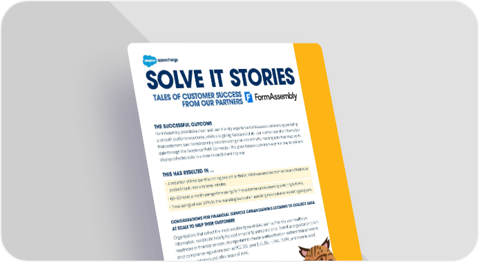 SOLSOLVE IT STVE IT STORIESORIES TALES OF CUSTOMER SUCCESS FROM OUR PARTNERS THE SUCCESSFUL OUTCOME FormAssembly provided a clean and user-friendly experience for Kasasa’s customers by providing a smooth platform experience, while also giving Kasasa absolute user control over the information that customers saw. FormAssembly provides a single source of truth, housing data that stays up to date through the Salesforce Prefill Connector. This gives Kasasa customers a central way to pull and display collected data in a more impactful and tidy way. THIS HAS RESULTED IN ... · A reduction of time spent launching product portfolios. What was once two to three hours of individual product input, now only takes minutes. · 60–80 hours a month average time savings for the customer success team by switching to forms. · Time savings of over 20% for the marketing team when launching new customer marketing programs. CONSIDERATIONS FOR FINANCIAL SERVICES ORGANIZATIONS LOOKING TO COLLECT DATA AT SCALE TO HELP THEIR CUSTOMERS Organizations that collect the most sensitive types of data, such as financial and healthcare information, need to be heavily focused on security and compliance. Even if an organization isn’t in healthcare or financial services, it’s important to choose a data collection platform that adheres to strict compliance regulations such as PCI DSS Level 1, GLBA, HIPAA, FERPA, and more to build trust with customers and offer peace of mind. Learn More Learn more about FormAssembly for Salesforce on AppExchange.
