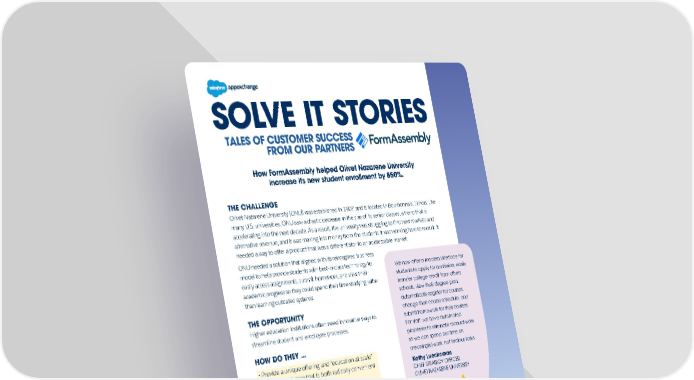 SOLVE IT STORIES TALES OF CUSTOMER SUCCESS FROM OUR PARTNERS THE SUCCESSFUL OUTCOME The ONU Global academic team and ElevateActual (another Salesforce partner) joined forces to create a new, groundbreaking program called Your Way built on Salesforce and FormAssembly, designed to offer ONU students tuition-free general education courses. This dynamic learning environment is made up of small, bite-sized lessons in myTrailhead, a digital campus and online classrooms using Communities (Experience Cloud), and a modern interface using FormAssembly. The program classes encourage community, open discussion, and gamification elements to shift the focus away from achievement and more on the educational journey. By pairing FormAssembly with Experience Cloud and myTrailhead via a seamless Salesforce connection, ONU was able to eliminate an outdated portal and deliver a learning management system that is beautiful and scalable. FormAssembly also has a low-code to no-code interface that allows ONU to innovate despite having no development team, providing the team with the flexibility to iterate as they meet student needs with a consumer-grade interface. ONU used FormAssembly and Salesforce to build the following features of Your Way: · Automated application process: Using dynamic picklists, prospects and students can instantly see how their courses will transfer to ONU and then create the transfer course records instantly with FormAssembly forms. This automates the articulation process for transfer coursework and credit, drastically cutting the processing time for the admissions team. There is now an applicant-facing FormAssembly form that not only takes students’ demographic information and builds their education history, but also allows students to detail their transcript to speed transfer credit evaluation. · Coursework management: Students submit all work through Experience Cloud, using authenticated FormAssembly forms. Faculty grade and give feedback on all assessments through FormAssembly forms. · Coursework scheduling: The default course scheduling process includes record automation with auto-submitting of FormAssembly forms. With self-service course rescheduling, students have the ability to quickly swap out courses or move their schedule around entirely in FormAssembly. · Prefill connector: Using FormAssembly’s prefill connector alongside form workflows, ONU and ElevateActual are able to leverage a form tool as a user-experience builder. This allows users to seamlessly transition from one page to another while writing data to, and reading records from, Salesforce to personalize the experience, all with a simple page load.