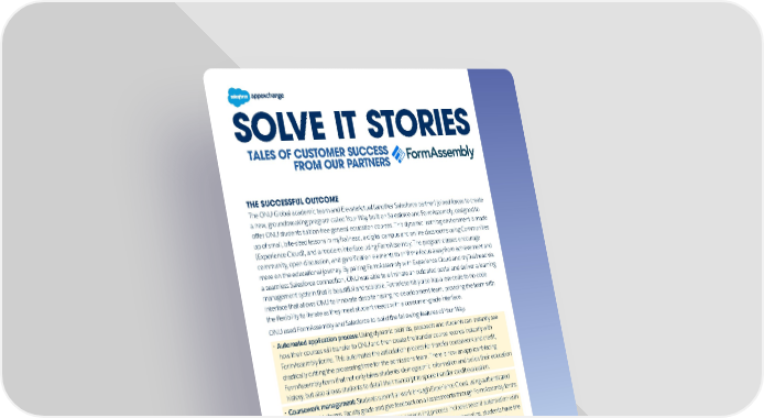 SOLVE IT STORIES TALES OF CUSTOMER SUCCESS FROM OUR PARTNERS THE SUCCESSFUL OUTCOME The ONU Global academic team and ElevateActual (another Salesforce partner) joined forces to create a new, groundbreaking program called Your Way built on Salesforce and FormAssembly, designed to offer ONU students tuition-free general education courses. This dynamic learning environment is made up of small, bite-sized lessons in myTrailhead, a digital campus and online classrooms using Communities (Experience Cloud), and a modern interface using FormAssembly. The program classes encourage community, open discussion, and gamification elements to shift the focus away from achievement and more on the educational journey. By pairing FormAssembly with Experience Cloud and myTrailhead via a seamless Salesforce connection, ONU was able to eliminate an outdated portal and deliver a learning management system that is beautiful and scalable. FormAssembly also has a low-code to no-code interface that allows ONU to innovate despite having no development team, providing the team with the flexibility to iterate as they meet student needs with a consumer-grade interface. ONU used FormAssembly and Salesforce to build the following features of Your Way: · Automated application process: Using dynamic picklists, prospects and students can instantly see how their courses will transfer to ONU and then create the transfer course records instantly with FormAssembly forms. This automates the articulation process for transfer coursework and credit, drastically cutting the processing time for the admissions team. There is now an applicant-facing FormAssembly form that not only takes students’ demographic information and builds their education history, but also allows students to detail their transcript to speed transfer credit evaluation. · Coursework management: Students submit all work through Experience Cloud, using authenticated FormAssembly forms. Faculty grade and give feedback on all assessments through FormAssembly forms. · Coursework scheduling: The default course scheduling process includes record automation with auto-submitting of FormAssembly forms. With self-service course rescheduling, students have the ability to quickly swap out courses or move their schedule around entirely in FormAssembly. · Prefill connector: Using FormAssembly’s prefill connector alongside form workflows, ONU and ElevateActual are able to leverage a form tool as a user-experience builder. This allows users to seamlessly transition from one page to another while writing data to, and reading records from, Salesforce to personalize the experience, all with a simple page load.