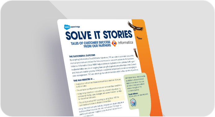 SOLVE IT STORIES TALES OF CUSTOMER SUCCESS FROM OUR PARTNERS THE SUCCESSFUL OUTCOME By adopting Informatica Cloud MDM for Salesforce, TTC was able to automate many of its manual processes and reduce the time and resources needed to administer its Salesforce instance. Informatica Cloud MDM helped eliminate duplicates in the database both upon implementation and on an ongoing basis using its duplicate prevention layer in the Contact and Account creation process. With just a small internal team and one vendor managing all data management, TTC was able to go live with Informatica within a few months of purchase. THIS HAS RESULTED IN ... · A reduction in the time it takes to import daily data from 36 hours With Informatica, data is readily to 60 minutes. available to all our staff and · The ability to identify and fix errors and re-import data in real time. digital channels so they can · A days-long reduction in setup time by automatically uploading provide a truly personalized complex territories, sales manager, and account ownership rules service throughout the for more than 500 users. customer journey. · The ability to roll up YOY reporting by using Cloud MDM to Sarah Hillman summarize and store multi-dimensional data. GLOBAL HEAD OF CRM AND DATA Using Informatica to automatically integrate and cleanse data from multiple different sources into one home allows TTC to gain a plethora of customer insights in order to drive their service and business decisions. CONSIDERATIONS FOR CUSTOMERS TO MAXIMIZE EFFICIENCY, CUT COSTS, AND EMBRACE PROCESS MANAGEMENT · Customers should be mindful not just of the data sets they would like to analyze, but also the quality of that data. Bad data in equals bad data out, so when looking to integrate data into analysis, it is also a good time to consider data quality and data governance. · Since datasets are always changing and growing, the possibilities are endless for deriving new ways to better serve customers. Be creative and don’t be afraid to ask the “what if” questions. Learn more about Informatica’s solution for data cleansing, consolidation, and hierarchy management on AppExchange.