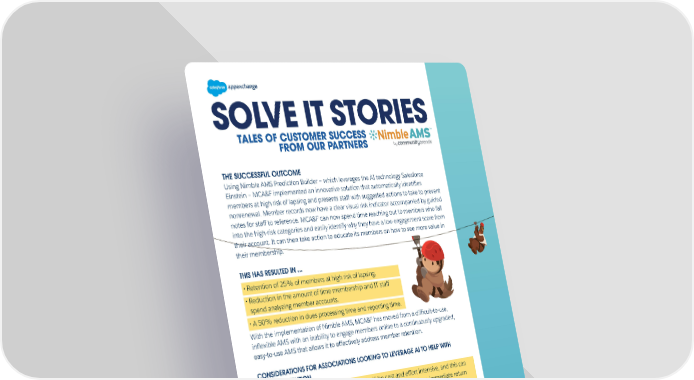 SOLVE IT STORIES SOLVE IT STORIES THE SUCCESSFUL OUTCOME Using Nimble AMS Prediction Builder – which leverages the AI technology Salesforce Einstein – MCA&F implemented an innovative solution that automatically identifies members at high risk of lapsing and presents staff with suggested actions to take to prevent nonrenewal. Member records now have a clear visual risk indicator accompanied by guided notes for staff to reference. MCA&F can now spend time reaching out to members who fall into the high-risk categories and easily identify why they have a low engagement score from their account. It can then take action to educate its members on how to see more value in their membership. THIS HAS RESULTED IN ... · Retention of 25% of members at high risk of lapsing. · Reduction in the amount of time membership and IT staff spend analyzing member accounts. · A 50% reduction in dues processing time and reporting time. With the implementation of Nimble AMS, MCA&F has moved from a difficult-to-use, inflexible AMS with an inability to engage members online to a continuously upgraded, easy-to-use AMS that allows it to effectively address member retention. CONSIDERATIONS FOR ASSOCIATIONS LOOKING TO LEVERAGE AI TO HELP WITH MEMBER RETENTION · Associations are sometimes afraid that AI will be cost and effort intensive, and this can be a huge mental barrier. AI is ready today, which means there is an immediate return on investment. · AI is an ongoing process to implement. With Prediction Builder licenses, associations have room to grow and do more predictions to proactively gain insight into common questions and challenges. · Start simple, then grow, refine, and adapt. It is better to get started with AI and get momentum going than wait for the perfect situation. Learn more about this solution for predicting and creating intelligent, personalized experiences for your members in less time with Nimble AMS by Community Brands, built on Salesforce.