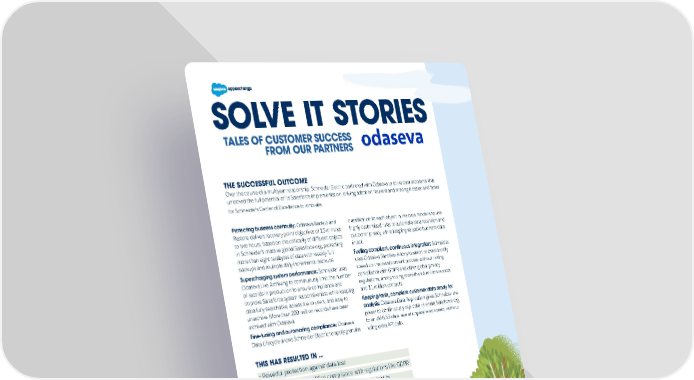 SOLVE IT STORIES TALES OF CUSTOMER SUCCESS FROM OUR PARTNERS THE SUCCESSFUL OUTCOME Over the course of a multiyear relationship, Schneider Electric partnered with Odaseva to solve data problems that unlocked the full potential of its Salesforce implementation, driving adoption forward and making it easier and faster . for Schneider’s Center of Excellence to innovate Protecting business continuity: Odaseva Backup and classification to each object in the data model and use Restore delivers recovery point objectives of 15 minutes highly customized rules to automate data retention and to two hours, based on the criticality of different objects customer privacy, while keeping valuable business data in Schneider’s massive global Salesforce org, protecting intact. more than eight terabytes of data with weekly full Fueling compliant, continuous integration: Schneider backups and multiple daily incremental backups uses Odaseva Sandbox Anonymization to dramatically Supercharging system performance: Schneider uses speed up the development process without risking Odaseva Live Archiving to continuously limit the number compliance with GDPR and other global privacy of records in production to ensure compliance and regulations, anonymizing more than 6 million records improve Salesforce system responsiveness while keeping and 11 million contacts. data fully searchable, accessible to users, and easy to Keeping fresh, complete customer data ready for unarchive. More than 200 million records have been analysis: Odaseva Data Replication gives Schneider the archived with Odaseva. power to continuously replicate its entire Salesforce org Fine-tuning and automating compliance: Odaseva to an AWS S3 data lake at unparalleled speed, without Data Lifecycle allows Schneider Electric to apply granular using extra API calls. THIS HAS RESULTED IN ... · Powerful protection against data loss · Streamlined and simplified compliance with regulations like GDPR · Improved Salesforce Platform performance and stability · Faster development cycles · Better ability to run analysis on fresh, complete Salesforce data CONSIDERATIONS FOR CUSTOMERS WHO ARE LOOKING FOR AN ENTERPRISE SALESFORCE DATA PROTECTION SOLUTION: To be effective, your solution should: · Support your entire data model, including all metadata and parent-child relationships · Deliver true enterprise-grade security, ensuring only you can see your data, allowing you to bring your own security keys, and encrypting data to the field level · Support a comprehensive restore plan capable of meeting your recovery time objective Learn More Learn more about Odaseva’s backup and restore solution for enterprises on AppExchange.