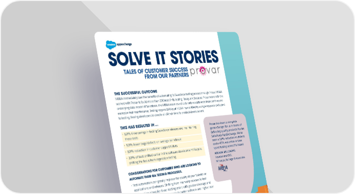 SOLVE IT STORIES TALES OF CUSTOMER SUCCESS FROM OUR PARTNERS THE SUCCESSFUL OUTCOME MB&A immediately saw the benefits of automating its Salesforce testing process through Provar. MB&A worked with Provar to build more than 200 tests in its testing library, and because Provar works with the underlying data model of Salesforce, the MB&A team could build unbreakable tests that didn’t require excessive test maintenance. Testing responsibilities at MB&A have shifted to a single resource dedicated to testing, freeing developers to devote all of their time to product development. THIS HAS RESULTED IN ... · 60% time savings in testing Salesforce releases and maintaining Provar has been a complete those tests game-changer for us in terms of delivering quality products for the · 50% fewer bugs/defects on average per release Salesforce AppExchange. We’ve · 80% reduction in customer support tickets seen a 50% reduction in defects and a 45% reduction in time · 30% of tests shifted earlier in the software development lifecycle, spent testing across the board. shifting the focus from regression testing JOSHUA MILLSAPPS Founder and CEO, CONSIDERATIONS FOR CUSTOMERS WHO ARE LOOKING TO Millsapps, Ballinger & Associates AUTOMATE THEIR QA TESTING PROCESSES. · Test automation can greatly improve the quality of your Salesforce applications and releases. Shifting from manual processes to test automation allows for fewer testing errors with greater coverage and test reusability. This ultimately leads to better software and higher user satisfaction with your customers. · Test automation isn’t one size fits all. When developing your test automation plan, pay attention to context. You should consider testing skills, tools, level of DevOps process, release quality history (success vs. failures), and your organization’s level of testing maturity. . Learn more about Provar for Salesforce on AppExchange.