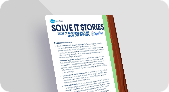 SOLVE IT STORIES SOLVE IT STORIES The Successful Outcome • Single source of truth at sellers’ fingertips: Deel stores everything in Spekit, from product information, workflow guides, FAQ, and key updates/ announcements. The content in Spekit is easy to update by designated experts, meaning all of the latest information is stored in one place without the worry of others overriding content. The FAQ eliminate sales reps’ need to constantly reach out to managers or their peers. • Contextual Salesforce training: Spekit’s just-in-time learning platform allows Deel to embed Speks (customizable bite-size pieces of information) directly into Salesforce, meaning sales reps are able to view definitions, processes, and policies in context, without leaving their flow of work. Just-in-time learning helps give employees the tools they need to be more productive and confident in their knowledge. • Communicating process changes: Deel can communicate any organizational process changes via Spotlights (timely, contextual popups). Spotlights can be customized by role, the end user’s URL, and other variables to ensure team members receive only relevant information. • Training feedback loop: The team can analyze engagement with new process changes by creating knowledge checks (short quizzes or pulse checks that are embedded in the flow of work). This has been a quick and easy way to create a positive two-way feedback loop between admins/knowledge-check creators and viewers/employees. Unlike more traditional long-form assessment methods that seek to “certify” knowledge or hit a training completion goal, knowledge checks are used as a form of learning that increases the efficacy of the training, improves retention of the key concepts communicated in that training, and drives greater productivity and understanding as a result. This has resulted in ... • 42% increased engagement with key communications and updates. • 15% less time spent searching for key processes and questions. • 10% increased efficiency for training content production and launch.