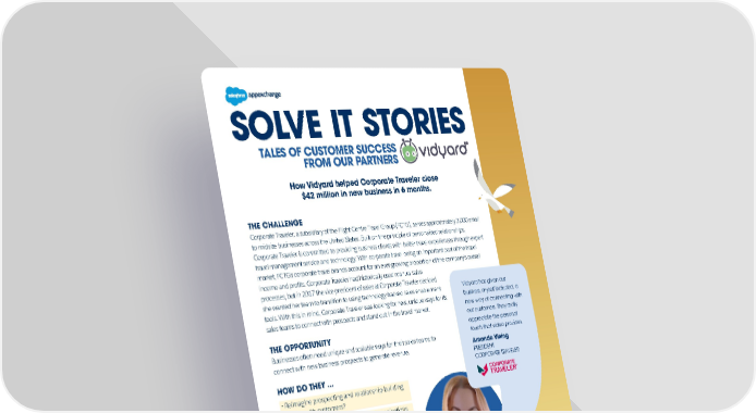 SOLVE IT STORIES TALES OF CUSTOMER SUCCESS FROM OUR PARTNERS THE SUCCESSFUL OUTCOME After discovering Vidyard, Corporate Traveler immediately saw the benefits of using it in many of its sales practices. With innovation in mind, Corporate Traveler began using Vidyard’s enterprise video platform to reach more clients with tech demos and to keep up with requests from its sales team. It also uses Vidyard as an outreach tool for its sales sequences. Previously the company had made 40 calls or sent 100 emails to get a sales meeting. The sales team found it only took 15 videos to reach the same outcome. The team is also able to easily see which videos have been viewed and for how long to help them make smarter strategic decisions. THIS HAS RESULTED IN ... I saw prerecorded · $42 million in new business closed in the first six months of fiscal videos as a more efficient way to deliver year ’21 using sales videos our services. · A 55% email open rate and a 75% email response rate from clients Alexandra Campione · A $3 million deal closed with a Boston biotech pharmaceutical client DIRECTOR OF after it received a personal outreach video using Vidyard SALES ENABLEMENT CORPORATE TRAVELER CONSIDERATIONS FOR CUSTOMERS WHO ARE LOOKING TO MODERNIZE THEIR SELLING PROCESSES · Videos are a great way to capture and retain someone’s attention. Rather than sending lengthy emails or dense PDF documents, videos provide a concise way to communicate ideas to an intended audience, saving not only time but money. · Videos present a unique opportunity to build and maintain relationships with your customers throughout the sales cycle. For Vidyard sales reps, consistent video reminders have allowed their customers to grow accustomed to account reps which became a huge competitive advantage. Sales reps noticed that video reminders made people feel more accountable to their sales teams · Videos can be used throughout any part of your sales cycle, even when the deal has already been secured. Following deal agreement discussions, videos can be a great tool to use for contract walk-throughs, handoffs to the customer service team, and general support. Wherever things need explaining, video makes it simple. Learn more about Vidyard for Salesforce on AppExchange.