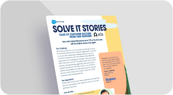 SOLVE IT STORIES SOLVE IT STORIES How Ada helped BlueJeans serve 72% of its chat users with its chatbot versus a live agent. The Challenge BlueJeans by Verizon is a communications technology company for enterprise productivity. It empowers organizations to succeed via secure video collaboration and large interactive events in a work-from-anywhere world. The pandemic presented both opportunities and challenges for BlueJeans’ sales and support teams. Free users, who don’t directly generate revenue for the “At BlueJeans, our core focus is our business, were generating a significant volume of customer customers. Ada is helping us elevate support inquiries and were often costly to serve. BlueJeans the support experience for all of our wanted to be available to all user types across the customer users — not just our largest customers. journey to offer a high-quality support experience to both This is what sets us apart from prospective and existing customers. our competitors.” CHADD THOMPSON The Opportunity Head of Marketing, BlueJeans Brands often need a way to show up instantly and consistently, any time and anywhere their customers need them, all while growing in popularity. How do they ... • Deliver valuable interactions at scale to meet people’s needs quickly? • Use every brand interaction as an opportunity to build trust, deliver value, and, ultimately, drive growth? • Purposefully automate conversations with customers across their lifecycle to save costs and grow revenue, all while treating every customer like a VIP? In the case of BlueJeans, it needed a needed a scalable solution that would allow it to offer quality of service for both its high-value enterprise customer base and free users. With the help of Ada, it was able to do this.