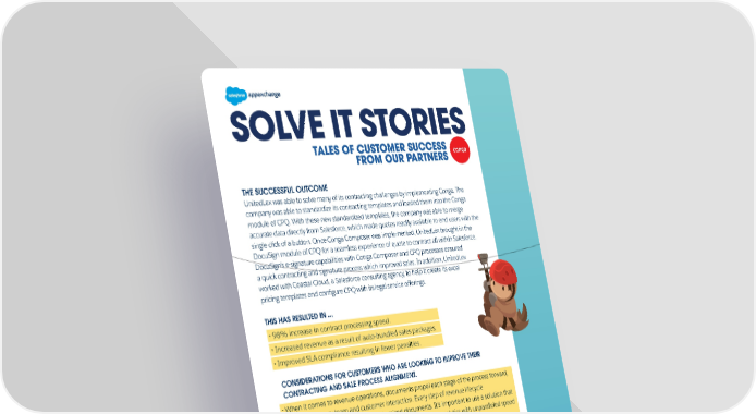 SOLVE IT STORIES SOLVE IT STORIES THE SUCCESSFUL OUTCOME UnitedLex was able to solve many of its contracting challenges by implementing Conga. The company was able to standardize its contracting templates and loaded them into the Conga module of CPQ. With these new standardized templates, the company was able to merge accurate data directly from Salesforce, which made quotes readily available to end users with the single click of a button. Once Conga Composer was implemented, UnitedLex brought in the DocuSign module of CPQ for a seamless experience of quote to contract all within Salesforce. DocuSign’s e-signature capabilities with Conga Composer and CPQ processes ensured a quick contracting and signature process which improved sales. In addition, UnitedLex worked with Coastal Cloud, a Salesforce consulting agency, to help it create its excel pricing templates and configure CPQ with its legal service offerings. THIS HAS RESULTED IN ... · 98% increase in contract processing speed. · Increased revenue as a result of auto-bundled sales packages. · Improved SLA compliance resulting in fewer penalties. CONSIDERATIONS FOR CUSTOMERS WHO ARE LOOKING TO IMPROVE THEIR CONTRACTING AND SALE PROCESS ALIGNMENT. · When it comes to revenue operations, documents propel each stage of the process forward, influencing every team and customer interaction. Every step of revenue lifecycle management requires personal, customized documents. It’s important to use a solution that helps you by providing real-time notifications, tracking, and analytics with unparalleled speed and accuracy, which can give maximum value out of every document, every time. · It’s important to have your data and information located all in one location. This process not only expedites data retrieval for contracting document generation, but it allows both internal and external stakeholders to rely on one source of truth to get the information they need. Learn more Learn more about Conga Composer for Salesforce on AppExchange.