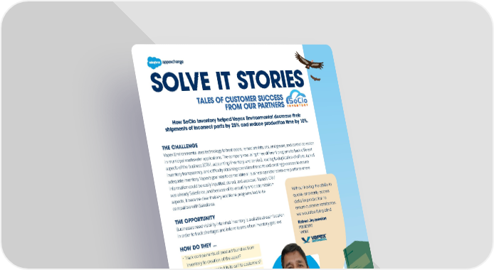 SOLVE IT STORIES TALES OF CUSTOMER SUCCESS FROM OUR PARTNERS THE SUCCESSFUL OUTCOME SoClo Inventory now performs Vapex’s processes involving purchasing/receiving, production, and inventory management and quality tracking. · Purchasing/receiving: Sets points for reorder points and reorder quantities; places purchase orders; receiving automatically replenishes the inventory count and tracks Work-In-Process (WIP) when items are pulled for an order, removing it from inventory · Production: Creates a Bill-of-Materials (BOM); recognizes shortage of items for a build; tracks subassemblies; shows full flow of sale from quote to receipt of purchase order to production to shipping to asset management (maintenance, end of life, etc.) · Inventory Management: Gives visibility on inventory levels, reorder points, and reorder quantities; offers multiple vendor management and multiple warehouse capability · Accounting: Produces up-to-date inventory valuation and transactions for easy export to accounting systems. SINCE JULY 2022, THIS HAS RESULTED IN... · 0 missed shipments. · 10% reduced unit production time. · 25% decreased shipment of incorrect parts. · Reduced inventory levels overall, allowing a better understanding of parts costs and lead times. CONSIDERATIONS FOR CUSTOMERS Inventory costs directly impact your balance sheet, so cost reduction is key to a healthy product based business. · It is important to have visibility into which inventory is at every location, what the inventory cost, when it is obsolete, when you need to restock, and how many of each item are typically used in a time frame · Handle simple product sales and consumption as well as product hierarchies. · Forecast inventory needs based on history while pricing the products well for your customer · Diligently keep inventory updated to automatically minimize shrinkage Learn More Learn more about SoClo Inventory for Salesforce on AppExchange.