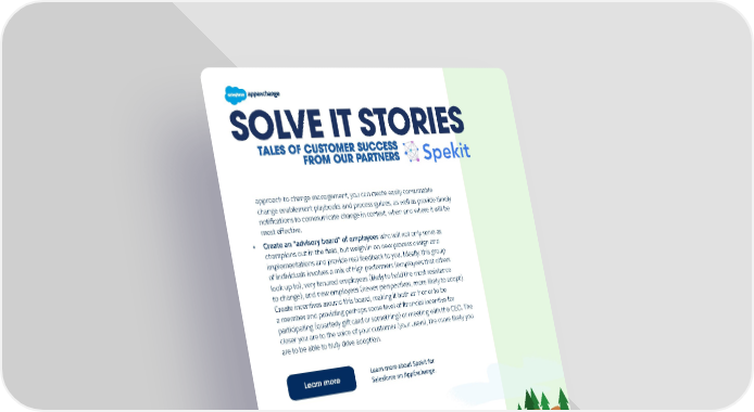 SOLVE IT STORIES SOLVE IT STORIES approach to change management, you can create easily consumable change enablement playbooks and process guides, as well as provide timely notifications to communicate change in context, when and where it will be most effective. • Create an “advisory board” of employees who will not only serve as champions out in the field, but weigh in on new process design and implementations and provide real feedback to you. Ideally, this group of individuals involves a mix of high performers (employees that others look up to), very tenured employees (likely to hold the most resistance to change), and new employees (newer perspectives, more likely to adopt). Create incentives around this board, making it both an honor to be a member and providing perhaps some level of financial incentive for participating (quarterly gift card or something) or meeting with the CEO. The closer you are to the voice of your customer (your users), the more likely you are to be able to truly drive adoption. Learn more Learn more about Spekit for Salesforce on AppExchange.