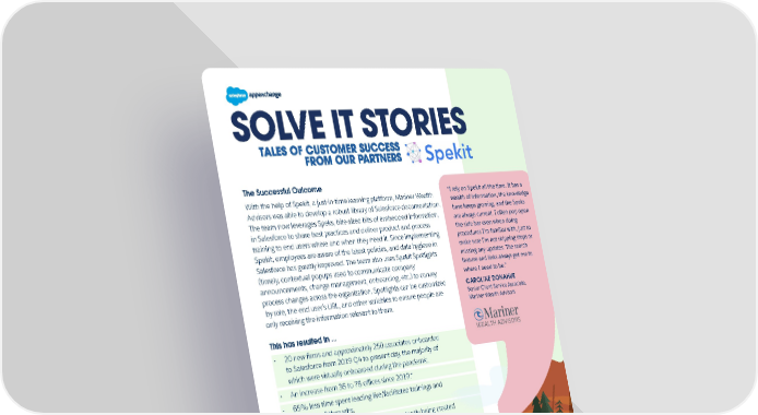 SOLVE IT STORIES SOLVE IT STORIES The Successful Outcome With the help of Spekit, a just-in-time learning platform, Mariner Wealth “I rely on Spekit all the time. It has a Advisors was able to develop a robust library of Salesforce documentation. wealth of information, the knowledge The team now leverages Speks, bite-sized bits of embedded information, base keeps growing, and the Speks are always current. I often pop open in Salesforce to share best practices and deliver product and process the side bar even when doing training to end users where and when they need it. Since implementing procedures I’m familiar with, just to Spekit, employees are aware of the latest policies, and data hygiene in make sure I’m not skipping steps or Salesforce has greatly improved. The team also uses Spekit Spotlights missing any updates. The search (timely, contextual popups used to communicate company feature and links always get me to announcements, change management, onboarding, etc.) to convey where I need to be.” process changes across the organization. Spotlights can be customized CAROLINE DONAHUE by role, the end user’s URL, and other variables to ensure people are Senior Client Service Associate, only receiving the information relevant to them. Mariner Wealth Advisors This has resulted in ... • 20 new firms and approximately 250 associates onboarded to Salesforce from 2019 Q4 to present day, the majority of which were virtually onboarded during the pandemic. • An increase from 36 to 78 offices since 2019.* • 65% less time spent leading live/facilitated trainings and one-off walkthroughs. • Over 400 Speks, with more content constantly being created to support new policies, processes, and data health. • Two promotions in three years for Logan, in part due to Spekit helping her boost her own productivity and get others engaged with training content. Considerations for customers looking to keep the employee experience top of mind while rolling out process changes include: • Develop a repeatable and documented change enablement process to reduce surprises and ease the friction of change. Change management doesn’t need to be a huge, cumbersome effort. A just-in-time learning approach to change enablement allows you to easily provide ongoing, bite-sized training and reinforcement throughout every size process change. With this more agile * Office count is accurate as of 10/2022.