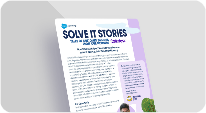 SOLVE IT STORIES SOLVE IT STORIES The Successful Outcome After evaluating other o昀昀erings and their compatibility with Service Cloud Voice, Mercado Libre decided to move forward with Talkdesk, which ultimately drove operational e昀케ciencies — reducing costs and increasing revenue. Talkdesk provided the 昀氀exibility for agents to be on either the open CTI solution or the SCV solution. Talkdesk’s strong integration with Service Cloud Voice and implementation speed made it a sure昀椀re winner for Mercado Libre. The Talkdesk implementation took only 46 days using four sprints across 昀椀ve di昀昀erent countries, and despite this, no operations were halted during the entire process. Mercado Libre expanded from having two contact centers to seven contact centers which expands their reach within LATAM. This has resulted in ... • Improved agent experience and satisfaction • The consolidation of two major data sources — operational and administrative — resulting in the ability to monitor regional call centers more closely • A deeper understanding of quality performance and operational metrics to drive e昀케ciency and customer experience improvements Considerations for customers who are looking to provide exceptional customer service experiences: • Invest in your service agents. In order to provide great customer experiences, agents need to trust they have the right tools to do their jobs successfully. A great service agent experience can ensure happier customers and increased sales. • Flexibility and reliability are key in today’s hybrid workforce. Leveraging the right cloud contact solution can make implementation quick and easy, no matter where in the world your team is located. • Strong reporting of agent performance and operational metrics can create a culture of transparency. It can also increase the opportunity for learnings that can result in improvements in agent and customer experience operations. Learn more Learn more about Talkdesk for Salesforce on AppExchange.