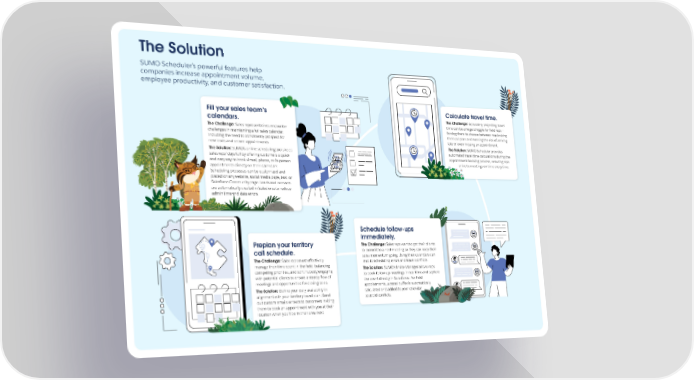 The Solution SUMO Scheduler’s powerful features help companies increase appointment volume, employee productivity, and customer satisfaction. Fill your sales team’s Calculate travel time. calendars. The Challenge: Accurately projecting travel time can be a huge struggle for field reps — The Challenge: Sales representatives encounter forcing them to choose between maximizing challenges in maintaining a full sales calendar, their call plan and running the risk of arriving including the need to consistently prospect for late or even missing an appointment. new leads and secure appointments. The Solution: SUMO Scheduler provides The Solution: SUMO’s online scheduling tools keep automated travel time calculations during the sales reps’ days full by offering customers a quick appointment booking process, ensuring reps and easy way to book virtual, phone, or in-person arrive to meetings on time every time. appointments directly on their calendars. Scheduling processes can be customized and placed on any website, social media page, text, or Salesforce Community page. Leads and contacts are automatically created in Salesforce to reduce admin time and data errors. Schedule follow-ups immediately. Preplan your territory The Challenge: Sales reps want to get their clients call schedule. to commit to a next meeting so they can keep their sales momentum going. Using their calendars can The Challenge: Sales reps must effectively lead to scheduling errors and travel conflicts. manage their time spent in the field, balancing The Solution: SUMO's Invite Manager allows reps competing priorities, and continuously engaging to book follow-up meetings in real time and capture with potential clients to ensure a steady flow of the event directly in Salesforce. For field meetings and opportunities for closing sales. appointments, a travel buffer is automatically The Solution: Define your daily availability in calculated and added to your calendar alignment with your territory travel plan. Send to avoid conflicts. out custom emails or texts to customers inviting them to book an appointment with you at their location when you’ll be in their area next.