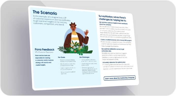 The Scenario In this example, let’s imagine how a VP of customer experience uses SurveyMonkey to get real-time insights on her industry, customers, competitors, and brand. SurveyMonkey solves Fiona’s challenges by helping her to: Use real-time customer insights to track sentiments about her company. The constant flow of market research data from 175M+ panelists in 130+ countries allows Fiona to keep a live pulse on consumer preferences. She is able to ensure respondents reflect the right target customers with 200+ attributes and custom screeners available. AI digs through the data and alerts Fiona to any statistically significant shifts. Create a multidimensional, omni-channel NPS program. Fiona is now able to measure the impact of her company’s customer experience programs and understand how they measure up against competitors. Use customer satisfaction surveys to get actionable data. SurveyMonkey’s seamless Salesforce integration automatically feeds customer responses into Salesforce to create a single source of truth and ensure companywide visibility. Accurately determine the optimal price. In-product guidance and best practices make price optimization a breeze for Fiona’s team, and it helps ensure a positive customer experience at the point of purchase. Fiona and her team are responsible for creating a consumer-centric business strategy with end-to-end market insights. Fiona Feedback VP of Customer Experience Learn more about SurveyMonkey Enterprise Her Goals: • Evolve the company’s strategy and stay on top of global trends • Meet the diverse needs of the company’s customer base • Create a single source of truth for customer feedback • Deliver an excellent customer experience Her Challenges: • Tracking customer preferences across the U.S., Asia, and Europe • Determining optimal price points across markets • Overwhelming amount of disconnected feedback makes it difficult to understand what’s working well and where there are opportunities to improve