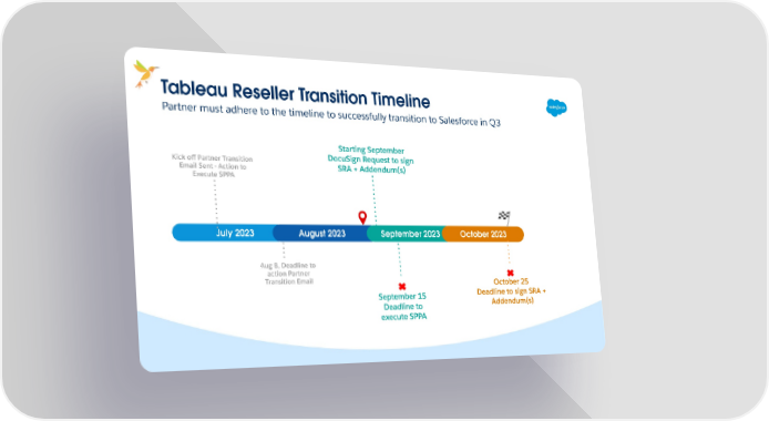 Tableau Reseller Transition Timeline Partner must adhere to the timeline to successfully transition to Salesforce in Q3 Starting September DocuSign Request to sign Kick off Partner Transition SRA + Addendum(s) Email Sent - Action to Execute SPPA July 2023 August 2023 September 2023 October 2023 Aug 8, Deadline to action Partner Transition Email October 25 Deadline to sign SRA + September 15 Addendum(s) Deadline to execute SPPA