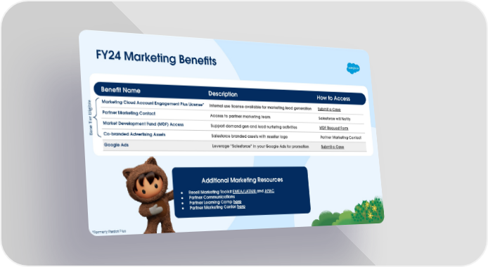 FY24 Marketing Benefits Benefit Name Description How to Access Marketing Cloud Account Engagement Plus License* Internal use license available for marketing lead generation Submit a Case Partner Marketing Contact Access to partner marketing team Salesforce will Notify ier Eligible Market Development Fund (MDF) Access Support demand gen and lead nurturing activities MDF Request Form Base T Co-branded Advertising Assets Salesforce branded assets with reseller logo Partner Marketing Contact Google Ads Leverage “Salesforce” in your Google Ads for promotion Submit a Case Additional Marketing Resources ● Resell Marketing Toolkit EMEA/LATAM and APAC ● Partner Communications ● Partner Learning Camp here ● Partner Marketing Center here *Formerly Pardot Plus