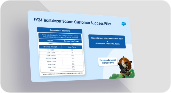 FY24 Trailblazer Score: Customer Success Pillar Renewals — 300 Points Points are allocated by evaluating a reseller's annual (Reseller Renewal Rate ÷ Renewal Rate Target) renewal rate and total amount of dollars renewed × Region Renewal Rate Target (TTM Renewal Amount Max. Points) Global 95% Renewal Amount* Max. Points $1 - $10K 50 $10K - $50K 75 $50K - $100K 150 $100K - $500K 200 Focus on Renewal $500K - $1M 225 Management $1M - $2M 250 $2M - $3M 275 $3M+ 300 *Tableau and Mulesoft products earn a 2x Renewal Amount accelerator