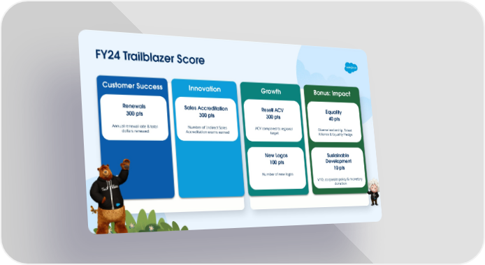 FY24 Trailblazer Score Bonus: Impact Innovation Customer Success Growth Renewals Sales Accreditation Resell ACV Equality 300 pts 300 pts 300 pts 40 pts Annual renewal rate & total Number of Indirect Sales ACV compared to regional Diverse leadership, Talent dollars renewed Accreditation exams earned target Alliance & Equality Pledge New Logos Sustainable Development 100 pts 10 pts Number of new logos VTO, corporate policy & monetary donation