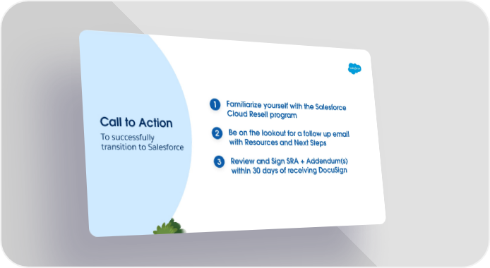 Familiarize yourself with the Salesforce 1 Cloud Resell program Call to Action Be on the lookout for a follow up email 2 To successfully with Resources and Next Steps transition to Salesforce Review and Sign SRA + Addendum(s) 3 within 30 days of receiving DocuSign