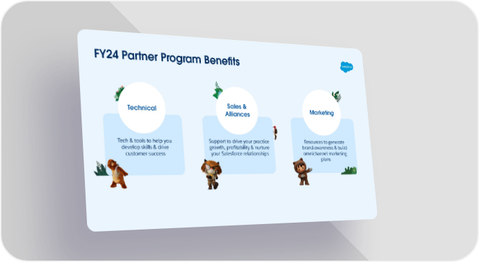 FY24 Partner Program Benefits Sales & Technical Marketing Alliances Tech & tools to help you Support to drive your practice Resources to generate growth, profitability & nurture develop skills & drive brand awareness & build customer success your Salesforce relationships omnichannel marketing plans