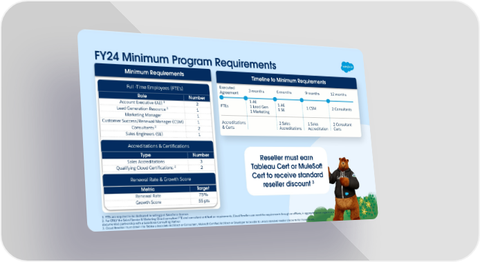FY24 Minimum Program Requirements Minimum Requirements Timeline to Minimum Requirements Executed 3 months 6 months 9 months 12 months Full -Time Employees (FTE’s) Agreement Role Number 1 AE 1 AE 1 Account Executive (AE) 2 FTEs 1 Lead Gen 1 CSM 2 Consultants 1 SE 1 1 Marketing Lead Generation Resource 1 Marketing Manager 1 Accreditations 2 Sales 1 Sales 2 Consultant Customer Success/Renewal Manager (CSM) 1 & Certs Accreditations Accreditation Certs 2 Consultants 2 Sales Engineers (SE) 1 1. Accreditations & Certifications Type Number Reseller must earn Sales Accreditations 3 2 Qualifying Cloud Certifications 2 Tableau Cert or MuleSo Cert to receive standard Renewal Rate & Growth Score 3 reseller discount Metric Target Renewal Rate 75% Growth Score 55 pts 1. FTEs are required to be dedicated to selling just Salesforce licenses 2. For ONLY the Sales/Service & Marketing Cloud consultant FTE and consultant certification requirements, Cloud Resellers can meet the requirements through an affiliate, in aggregate across regions or a documented partnership with a Salesforce Consulting Partner 3. Cloud Reseller must obtain the Tableau Associate Architect or Consultant, Mulesoft Certified Architect or Developer to be able to unlock standard reseller discounts for those clouds