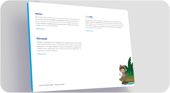 Nokia Software offers the industry’s most comprehensive portfolio of transformational TechSee enables service organisations to deliver remote assistance right from their 5G, cloud and software technologies to accelerate business and connect the world. Salesforce console. Using patented browser-based video, AR, and Computer Vision AI, Nokia and Salesforce help service providers with end-to-end digital transformation experts guide customers and technicians to resolutions. TechSee helps telecom groups through seamlessly integrated solutions; connecting the business to the network to such as Verizon, Vodafone, and Orange to reduce customer effort, cut operational reinvent customer journeys in the 5G era. costs, and increase service efficiency. Find out more > Find out more > Sitetracker is the leading project management ISV for large enterprises. 100% native to the Salesforce platform, Sitetracker helps deploy high volumes of complex projects across telecommunications, utilities, IoT, retail, and manufacturing. Companies like Vodafone, Verizon, Duke Energy, and Ericsson use Sitetracker to manage $24B+ of projects across millions of locations. Find out more > EMEA ISV Industry Booklet – Telecommunication