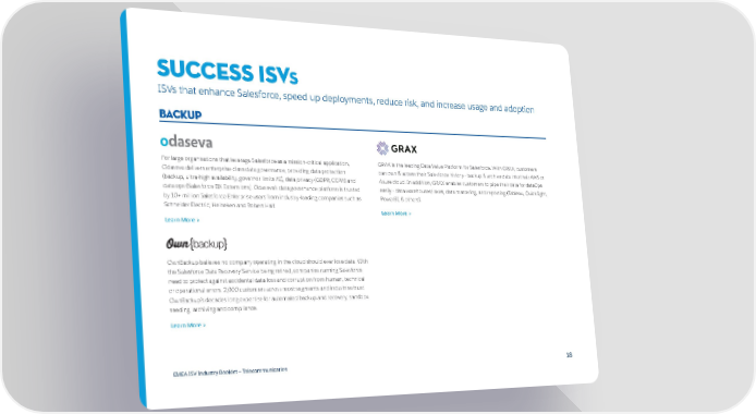 success ISVs ISVs that enhance Salesforce, speed up deployments, reduce risk, and increase usage and adoption backup For large organisations that leverage Salesforce as a mission-critical application, GRAX is the leading Data Value Platform for Salesforce. With GRAX, customers Odaseva delivers enterprise-class data governance, providing data protection can own & access their Salesforce history - backup & archive data into their AWS or (backup, ultra-high availability, governor limits AI), data privacy (GDPR, CCPA) and Azure cloud. In addition, GRAX enables customers to pipe their data for dataOps data ops (Salesforce DX Extensions). Odaseva’s data governance platform is trusted easily - data warehouses/lakes, data mastering, and reporting (Tableau, QuickSight, by 10+ million Salesforce Enterprise users from industry-leading companies such as PowerBI, & others). Schneider Electric, Heineken and Robert Half. Learn More > Learn More > OwnBackup believes no company operating in the cloud should ever lose data. With the Salesforce Data Recovery Service being retired, companies running Salesforce need to protect against accidental data loss and corruption from human, technical or operational errors. 2,000 customers across most segments and industries trust OwnBackup’s decades long expertise for automated backup and recovery, sandbox seeding, archiving and compliance. Learn More > EMEA ISV Industry Booklet — Telecommunication 1818