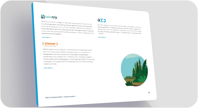 SalesTrip is an expense management and travel booking system on Salesforce. Do HR, talent, engagement, performance, people analytics, and payroll are high on the your employees waste time switching between Salesforce, travel booking sites and business agenda and, for Salesforce customers, XCD offers the only single solution. your expense system just to visit customers? SalesTrip combines this. As a business, With three-quarters of UK organisations predicted to increase their HR tech budget does it take days to reconcile these employee travel costs against specific customers, this year, the market potential is huge. So if they say HR, payroll or people software, projects and sales opportunities? SalesTrip automates this. Better manage and justify think XCD. expense spend with SalesTrip. Learn More > Learn More > Sirenum powers the world’s dynamic workforce. The world’s leading employers transform their business operations by relying on Sirenum to streamline the management of their hourly workers. Our cloud-based software enables management to save valuable time in scheduling shifts, managing compliance, monitoring staff, and processing payroll, while increasing gross profit for temporary staffing agencies struggling with the evolving demands of the rapidly emerging dynamic workforce. Learn More > EMEA ISV Industry Booklet — Telecommunication 16