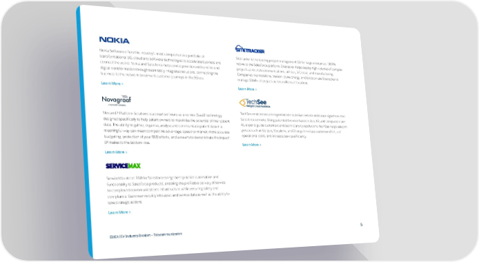 Nokia Software offers the industry’s most comprehensive portfolio of Sitetracker is the leading project management ISV for large enterprises. 100% transformational 5G, cloud and software technologies to accelerate business and native to the Salesforce platform, Sitetracker helps deploy high volumes of complex connect the world. Nokia and Salesforce help service providers with end-to-end projects across telecommunications, utilities, IoT, retail, and manufacturing. digital transformation through seamlessly integrated solutions, connecting the Companies like Vodafone, Verizon, Duke Energy, and Ericsson use Sitetracker to business to the network to reinvent customer journeys in the 5G era. manage $24B+ of projects across millions of locations. Learn More > Learn More > NovumIP Platform Solutions is a smart software-as-a-service (SaaS) technology TechSee enables service organisations to deliver remote assistance right from their designed specifically to help patent owners to maximise the potential of their patent Salesforce console. Using patented browser-based video, AR, and computer vision data. The ability to gather, organise, analyse and communicate patent data in a AI, experts guide customers and technicians to resolutions. TechSee helps telecom meaningful way can mean competitive advantage, speed-to-market, more accurate groups such as Verizon, Vodafone, and Orange to reduce customer effort, cut budgeting, protection of your R&D efforts, and a means to demonstrate the impact operational costs, and increase service efficiency. IP makes to the bottom-line. Learn More > Learn More > ServiceMax Asset 360 for Salesforce brings best-practice automation and functionality to Salesforce products, enabling the profitable delivery of service to complex telecommunications infrastructure while ensuring safety and compliance. Gain new visibility into asset and service data as well as the ability to take strategic actions. Learn More > EMEA ISV Industry Booklet — Telecommunication 5