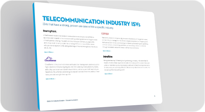 telecommunication INDUSTRY ISVs ISVs that have a strong, proven use case within a specific industry A SaaS-based solution that enables communication service providers (CSPs) to Telecommunications companies digitise work in Salesforce with Conga’s document, automate and streamline the end-to end selling, ordering and monetising processes contract lifecycle management (CLM) and e-signature applications. Conga supports of multi-partner offering. The platform is built on open architecture, open APIs both a direct and indirect commercial go-to-market by standardising and optimising and unique multi-tenancy capabilities allowing CSPs to co-create B2B solutions contracts at scale, streamlining workflows, and increasing customer satisfaction with partner ecosystems while taking advantage of new technologies such as cloud, through decreased transaction times or self-service e-commerce. IoT, AI, 5G. Learn More > Learn More > Recognised as a top 10 fastest growing technology company in Deloitte’s Fast 50 Awards, Introhive helps organisations realise the full value of their relationships and CloudSense is the proven commerce and subscriber management platform, built for under-utilised data. By ensuring adoption at all levels of Salesforce implementation, high-volume or complex ongoing services. It is trusted by communications, media, Introhive ensures users fully embrace CRM and keeps data clean and accurate, thus and utility businesses worldwide to launch faster, sell more, and fulfill faultlessly on increasing ROI and pipeline growth. Salesforce. CloudSense customers go to market in a third of the time, sell four times faster, and deliver eight times quicker. Learn More > Learn More > EMEA ISV Industry Booklet — Telecommunication 4