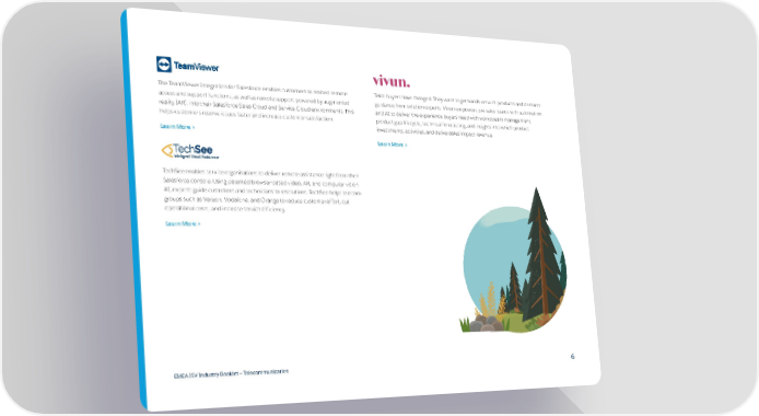 The TeamViewer integration for Salesforce enables customers to embed remote Telco buyers have changed. They want to get hands-on with products and demand access and support functions, as well as remote support powered by augmented guidance from solution experts. Vivun empowers pre-sales teams with automation reality (AR), into their Salesforce Sales Cloud and Service Cloud environments. This and AI to deliver the experience buyers need with workstream management, helps customers resolve issues faster and increase customer satisfaction. product gap lifecycle, technical forecasting, and insights into which product investments, activities, and deliverables impact revenue. Learn More > Learn More > TechSee enables service organisations to deliver remote assistance right from their Salesforce console. Using patented browser-based video, AR, and computer vision AI, experts guide customers and technicians to resolutions. TechSee helps telecom groups such as Verizon, Vodafone, and Orange to reduce customer effort, cut operational costs, and increase service efficiency. Learn More > EMEA ISV Industry Booklet — Telecommunication 6