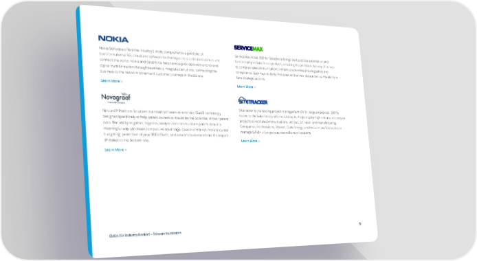 Nokia Software offers the industry’s most comprehensive portfolio of ServiceMax Asset 360 for Salesforce brings best-practice automation and transformational 5G, cloud and software technologies to accelerate business and functionality to Salesforce products, enabling the profitable delivery of service connect the world. Nokia and Salesforce help service providers with end-to-end to complex telecommunications infrastructure while ensuring safety and digital transformation through seamlessly integrated solutions, connecting the compliance. Gain new visibility into asset and service data as well as the ability to business to the network to reinvent customer journeys in the 5G era. take strategic actions. Learn More > Learn More > Sitetracker is the leading project management ISV for large enterprises. 100% NovumIP Platform Solutions is a smart software-as-a-service (SaaS) technology native to the Salesforce platform, Sitetracker helps deploy high volumes of complex designed specifically to help patent owners to maximise the potential of their patent projects across telecommunications, utilities, IoT, retail, and manufacturing. data. The ability to gather, organise, analyse and communicate patent data in a Companies like Vodafone, Verizon, Duke Energy, and Ericsson use Sitetracker to meaningful way can mean competitive advantage, speed-to-market, more accurate manage $24B+ of projects across millions of locations. budgeting, protection of your R&D efforts, and a means to demonstrate the impact IP makes to the bottom-line. Learn More > Learn More > EMEA ISV Industry Booklet — Telecommunication 5